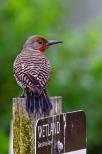 The 1st hole is a good chance to hear (and possibly see) a Pileated Woodpecker. Another woodpecker, one often cursed for drilling into the side of your house, is the Red-shafted Northern Flicker. This species can be seen all over the Seattle area, but lately seems to like (in addition to ants) the area around the 2nd hole. The pond down at the bottom of the 3rd hole is not only a great area to collect your wayward shots; it’s also a good place to see a Hooded Merganser.