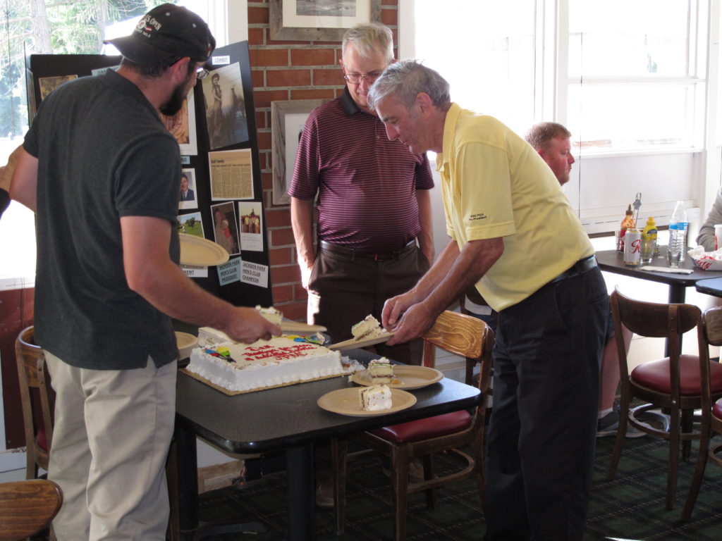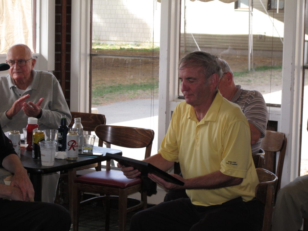 We had a great turn out and day for Fall Field Day and the celebration of #1 Sandbagger Dan Puetz, Sr. Dan’s three sons: Joe, Dan, and John, along with grandson Silas joined him, as well as friends Paul Bourgette and Larry Cook. Dick Rovig, Club Historian and Honorary Member, came for the festivities, which included President Jeff Schoening, on behalf of the Board of Directors, presenting a Lifetime Membership to Dan in recognition of his many years of service to the Men’s Club. Special thanks to John Clements and Lee Jones for organizing the festivities and to Pro Dan Harrington for managing the tournament and the scores on Saturday.